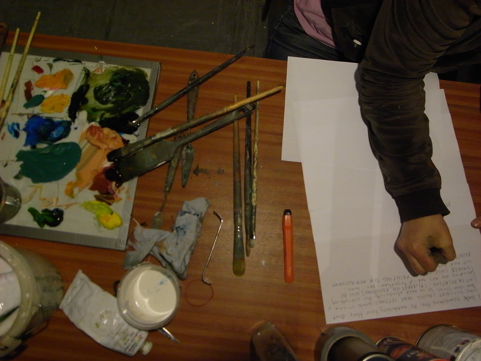 Maria begins by gluing square and triangular pieces of word together whilst Necole paints a reclining figure onto a small canvas. Alex’s place within the construction line takes on an interesting form when it becomes apparent that his printer is not going to work meaning he is left to work with the only tools available to him; A4 plain white paper, a pen and some blue-tack.